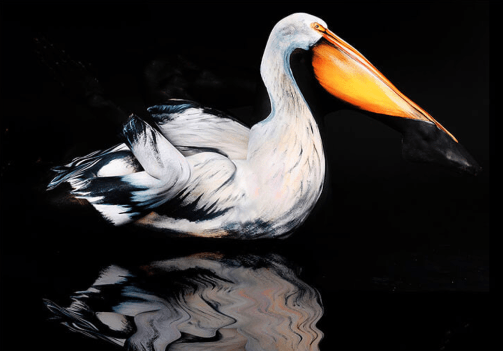 À primeira vista, parece ser um pássaro refletido na água. No entanto, ao observar com mais atenção, a ilusão é revelada: parte da imagem é uma perna humana, habilmente disfarçada como fundo. A obra impressiona pela precisão e atenção aos detalhes — um daqueles casos em que a arte literalmente engana os olhos.
