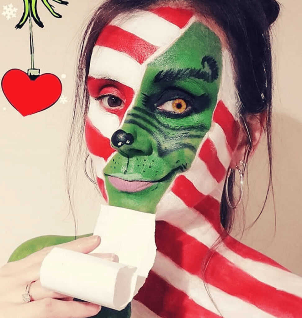 A arte corporal ilusória sempre evoca encantamento. Nesta obra, os fãs do Grinch reconhecerão facilmente uma imagem familiar. A execução meticulosa é impressionante: os detalhes são tão precisamente elaborados que criam uma sensação de volume e movimento. Particularmente impressionante é a folha de papel perfeitamente dobrada — à primeira vista, parece real.